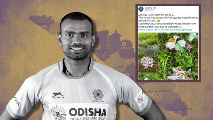 Sreejesh sharing images of the litter in his Twitter post, said, “Literacy 100% common sense 0, This is the way people of my village decorated the road named after me. Kunnathunadu/Kizhakkambalam village officers have to look at this issue & take a decision.”
