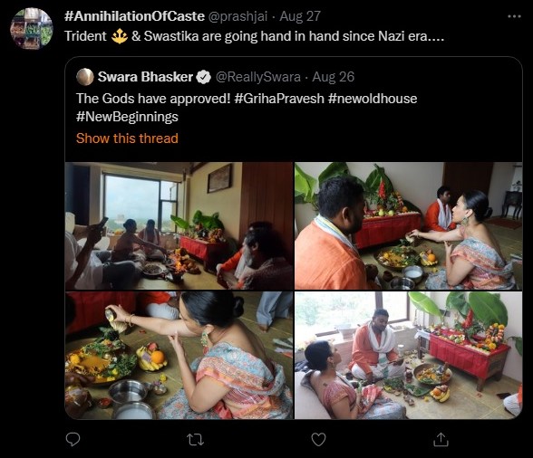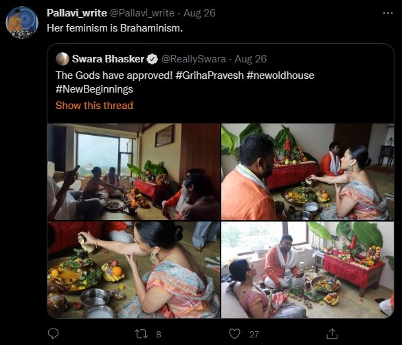 Again, we see the same hatred in operation when Swara Bhasker is attacked for performing rituals as per Hindu traditions and customs.