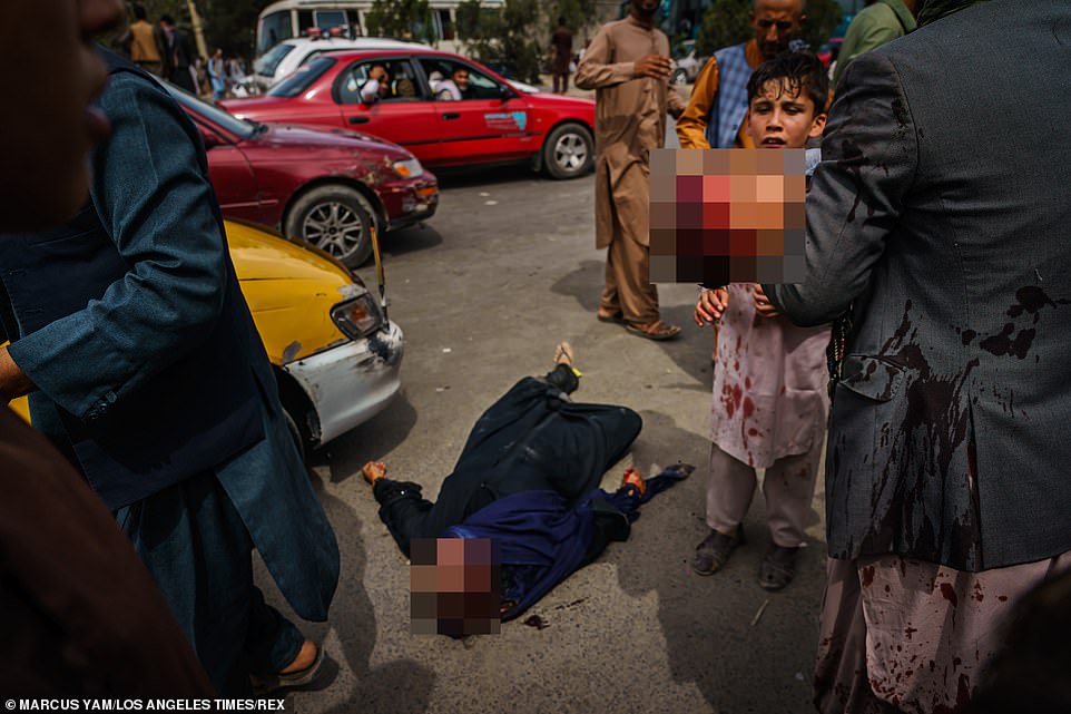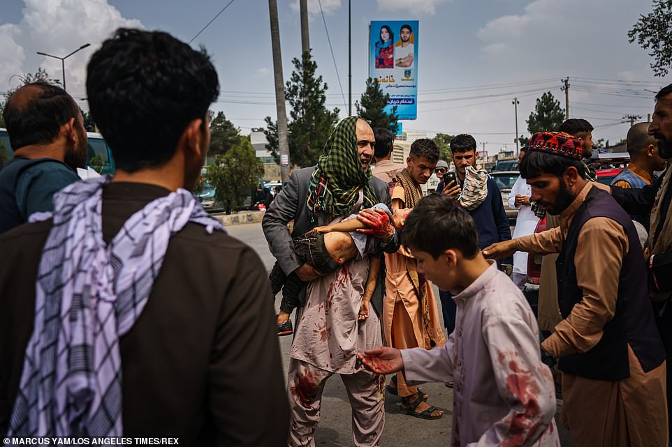 A child covered in blood was seen being carried away by his father after the Taliban launched an attack on the crowd at the Kabul international airport.