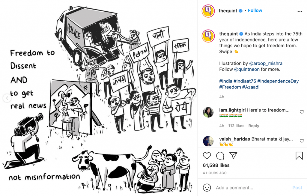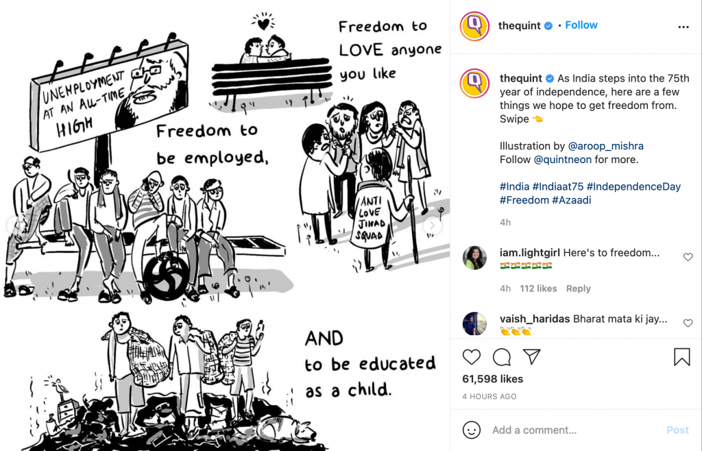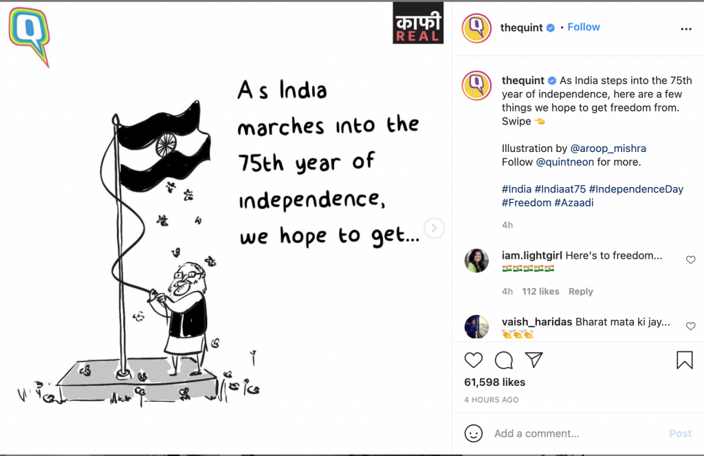 The first slide in the four-part comic shared by The Quint showed a man, likely Prime Minister Modi’s caricature, hoisting the national flag. It said how as India marches into 75th year of Independence, it hopes to get…’