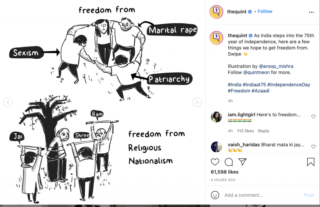 The Quint then says it wants freedom from sexism, marital rape and patriarchy. All legit and valid things to hope and wish to get freedom from. These are social evils which continue to plague us. However, right under it, The Quint talks about ‘freedom from religious nationalism’ and shows a man tied up to a tree with three men chanting ‘Jai Shri Raim’