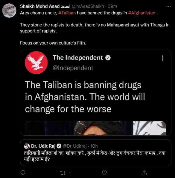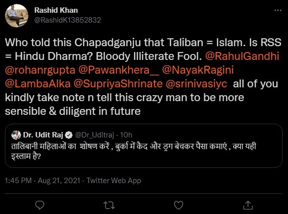 Udit Raj had earlier posted a tweet where he said that Taliban was subjugating women in Burkhas and earning money by selling drugs and questioned whether it was Islam. Islamists resorted to defending the Taliban and drawing comparisons with the RSS for that tweet.