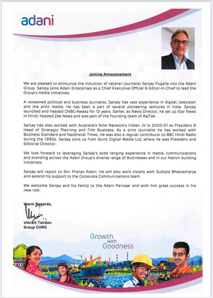 In an internal circular released by the company, it informed that Sanjay Pugalia has joined Adani Enterprises as Chief Executive Officer and Editor-in-chief to lead the group’s media initiatives. Just a day ago, Quint Digital Media Limited had informed that Sanjay Pugalia has resigned from the posts of President and Editorial Director at the company.