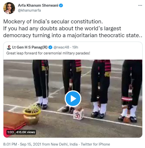 So-called journalist, Arfa Khanum Sherwani, was particularly agitated by the video and said, “Mockery of India’s secular constitution. If you had any doubts about the world’s largest democracy turning into a majoritarian theocratic state.”
