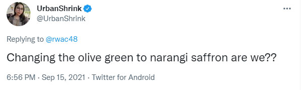UrbanShrink, who identifies herself as a counsellor for Queers, took a shot at Army and said, “Changing the olive green to narangi saffron are we??”