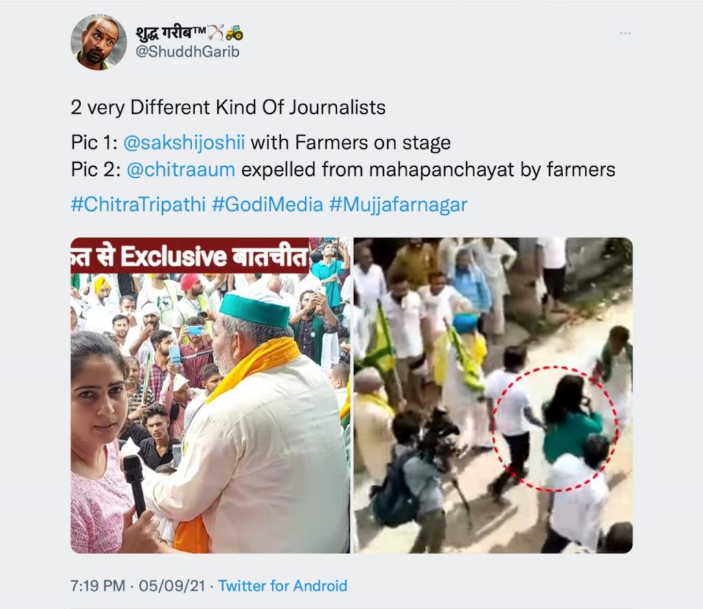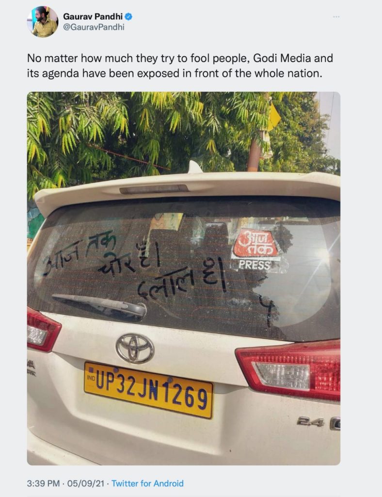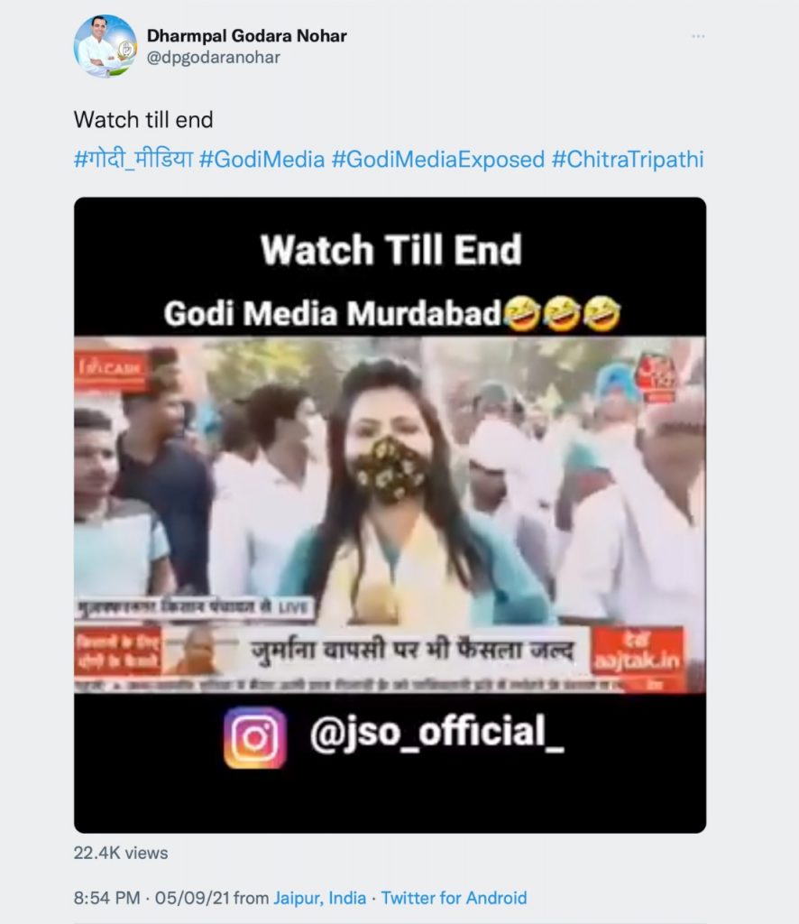 Congress functionaries also contributed to the party’s cause of deflecting criticism by blaming the media as a sellout. Dharmpal Godara Nohar, a Congress leader, recently gloated over the unbecoming treatment meted out to Aaj Tak journalist Chitra Tripathi at the farmers’ protests where she was heckled and harassed. It is worth noting that Tripathi later even tried to exonerate the hoodlums by normalising the heckling and harassment she faced. But for the Congress party, she was a part of their imaginary construct ‘Godi Media’.