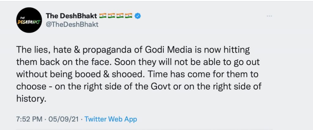 Besides blatantly fear-mongering, peddling lies, disinformation, and hurling unsubstantiated allegations, a key part of their campaign against the Centre entailed denigrating the independent media houses and journalists who refused to toe their line as ‘Godi Media’, a pejorative reference to media channels that insufferable left-leaning “intellectuals” accuse of being prejudiced in favour of the Modi government.