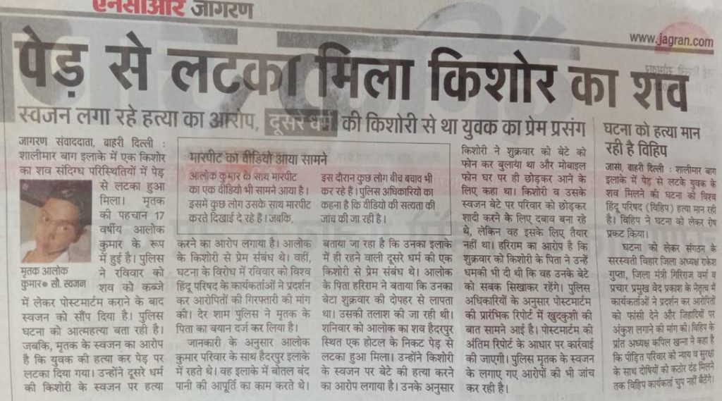 On Sunday, September 19, a 17-year-old teen’s body was found hanging from a tree under mysterious circumstances in Haiderpur, Shalimar Bagh area in Delhi. While the police claimed that it was a case of suicide, the bereaved family members of the deceased teenage boy and members of the Hindu outfit Vishwa Hindu Parishad (VHP) have termed it a murder.