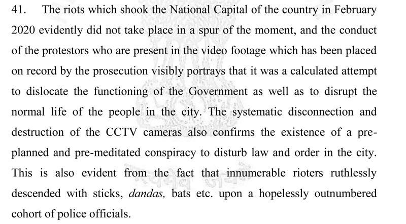 The court said, “The riots which shook the National Capital of the country in February 2020 evidently did not take place in a spur of the moment, and the conduct of the protestors who are present in the video footage which has been placed on record by the prosecution visibly portrays that it was a calculated attempt to dislocate the functioning of the Government as well as to disrupt the normal life of the people in the city.”