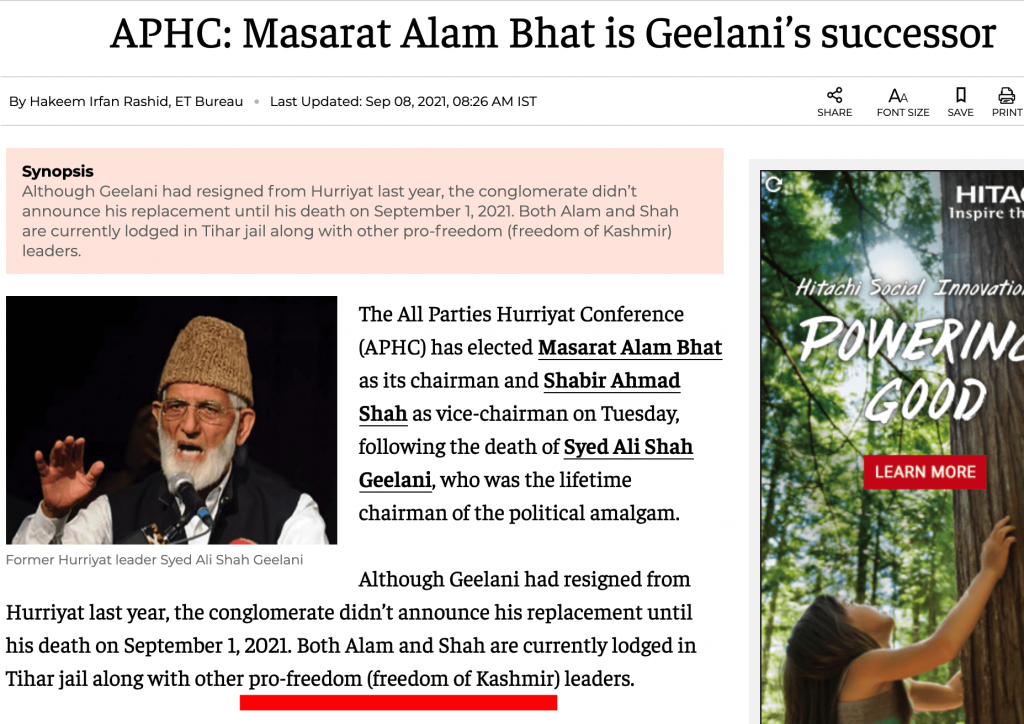 In an article titled “APHC: Masarat Alam Bhat is Geelani’s successor’ written by Hakeem Irfan Rashid, a correspondent with Economic Times, he refers to the separatist leaders, who are currently lodged in jail as ‘pro-freedom’ leaders. The Kashmiri separatist leaders, with support from Pakistan have been carrying out terror activities in the valley in name of ‘freedom’.