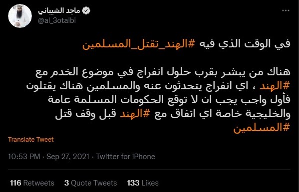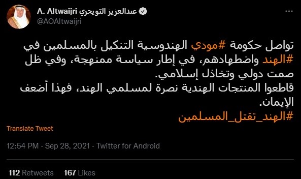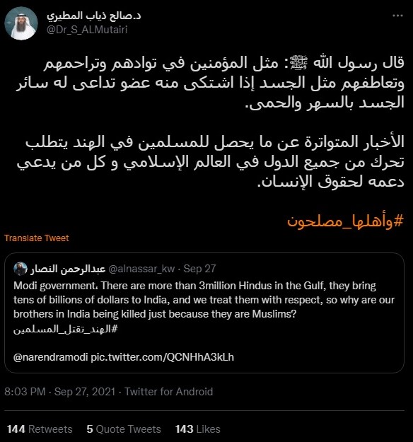 Al-Mutairi, who has over 65,000 followers on Twitter, also said that Islamic countries should come together to take action against India. He said, “The frequent news about what is happening to Muslims in India requires action from all countries in the Islamic world and everyone who claims to support human rights.”