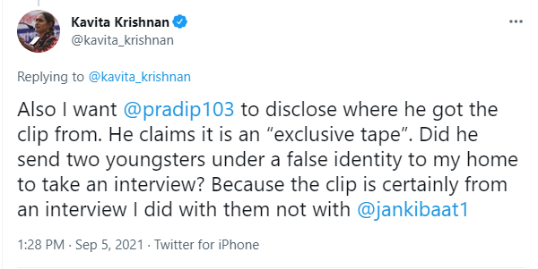 On Sunday (September 5), Kavita Krishnan took to Twitter to claim that she was being targeted for raising her voice against ‘Hindu supremacy’. She alleged that ‘Jan ki Baat’ had been running a show to brand her as ‘anti-Hindu’ on the basis of a short video clip.