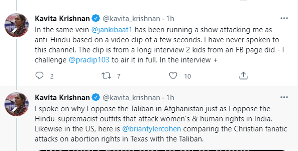 Furthermore, the Communist justified her bizarre analogies by citing the example of Brian Tyler Cohen, who in her view had earlier compared the ‘Christian fanatic attacks on abortion rights in Texas with the Taliban’. This is despite the fact that Cohen had made no such analogies. Kavita Krishnan also accused ‘Jan ki Baat’ founder of labelling her as ‘anti-Hindu’ and ‘anti-India.’