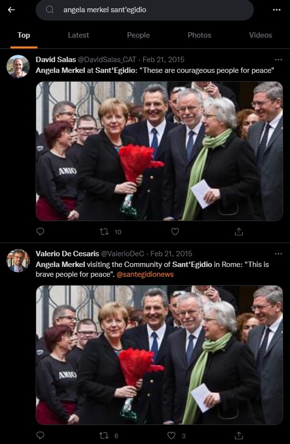 On Twitter, when one searches with the keywords “Angela Merkel sant’egidio”, the top results are from years prior and the latest results are all related to claims by Mamata Banerjee.