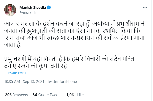 In a tweet, Sisodia wrote, “I am going to offer my prayers to Ram Lalla today. In Ayodhya, Lord Shri Ram set such a standard for the happiness of the people that even today ‘Ram Raj’ is considered to be the highest inspiration of clean governance and administration. I request the Lord to always preserve the purity in our thoughts.”