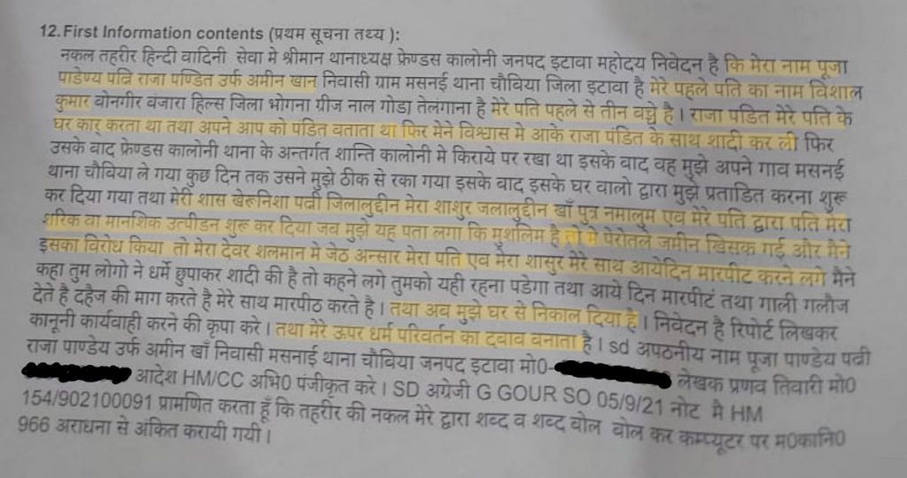 The case has been filed under IPC section 498A (dowry), 323 (voluntarily causing hurt), 504 (provocation through insult), 419 (cheating by impersonation) and other relevant sections of the Dowry Prohibition Act and UP’s Prohibition of Unlawful Religious Conversion Ordinance, 2020.