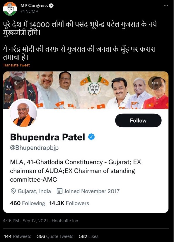 The Madhya Pradesh Congress is clutching at straws in its efforts to attack the Bharatiya Janata Party. After Bhupendra Patel was declared the new Chief Minister of Gujarat, the official Twitter handle of the Madhya Pradesh Congress claimed that it was a slap on the face of the citizens of Gujarat because Bhupendra Patel does not have enough followers on the social media platform.