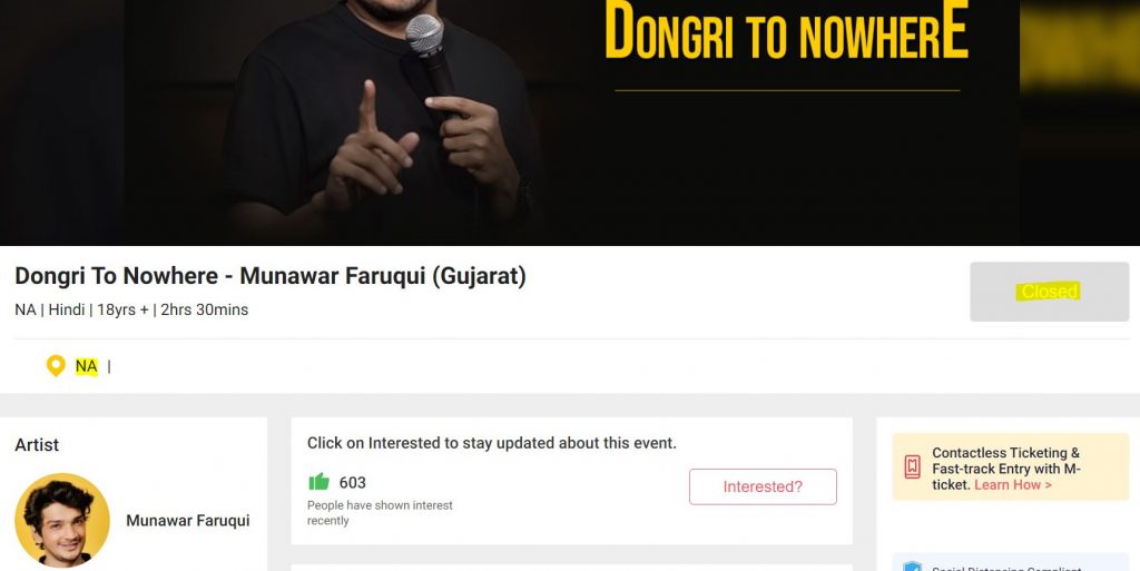 As one can see in the Bookmyshow app, Munawar Faruqui’s tour to Gujarat, which was a part of his tour named ‘Dongri to Nowhere’, stands closed.