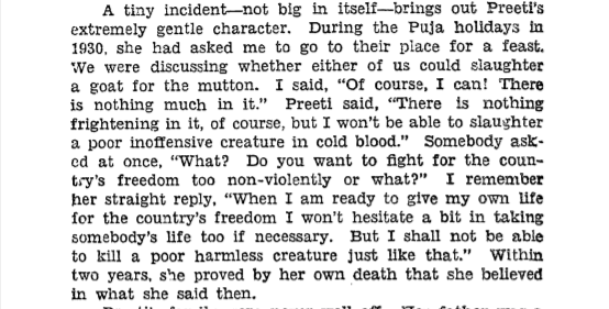 She narrated how Waddedar was reluctant to sacrifice a goat on Durga Puja, thereby making fellow revolutionaries question her ability at armed struggle. “Do you want to fight for the country’s freedom too non-violently or what?”, Pritilata was asked. She replied, “When I am ready to give my own life for the country’s freedom, I won’t hesitate a bit in taking somebody’s life too if necessary.” The incident went on to show the resolve and the fire of patriotism that was burning in her heart.