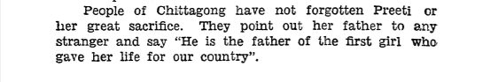 Through her example, she sent out a message to the women of Bengal that they can march shoulder to shoulder with men in liberating the country from the British. In her book, Kalpana Dutta recounted how the parents of Pritilata Waddedar were devasted at her loss. “People of Chittagong have not forgotten Preeti or her great sacrifice. They point out her father to any stranger and say, ‘He is the father of the first girl who gave her life for our country,” she concluded.