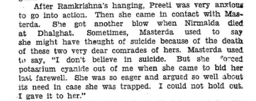 Pritilata was injured by a bullet wound. To avoid being captured by the British, she consumed a pill of potassium cyanide. Her martyrdom at the tender age of 21 years sent waves of inspiration for other revolutionaries in Bengal. Kalpana Dutta recounted in her book how Surya Sen was against the idea of handing potassium cyanide capsules to Pritilata Waddedar.