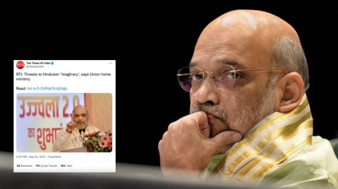 On Monday, The Times of India published a news report titled “RTI: Threats to Hinduism ‘imaginary’, says Union home ministry” that claimed that the Union Home Ministry led by Amit Shah has ‘categorically stated’ that Hinduism faces no threats.