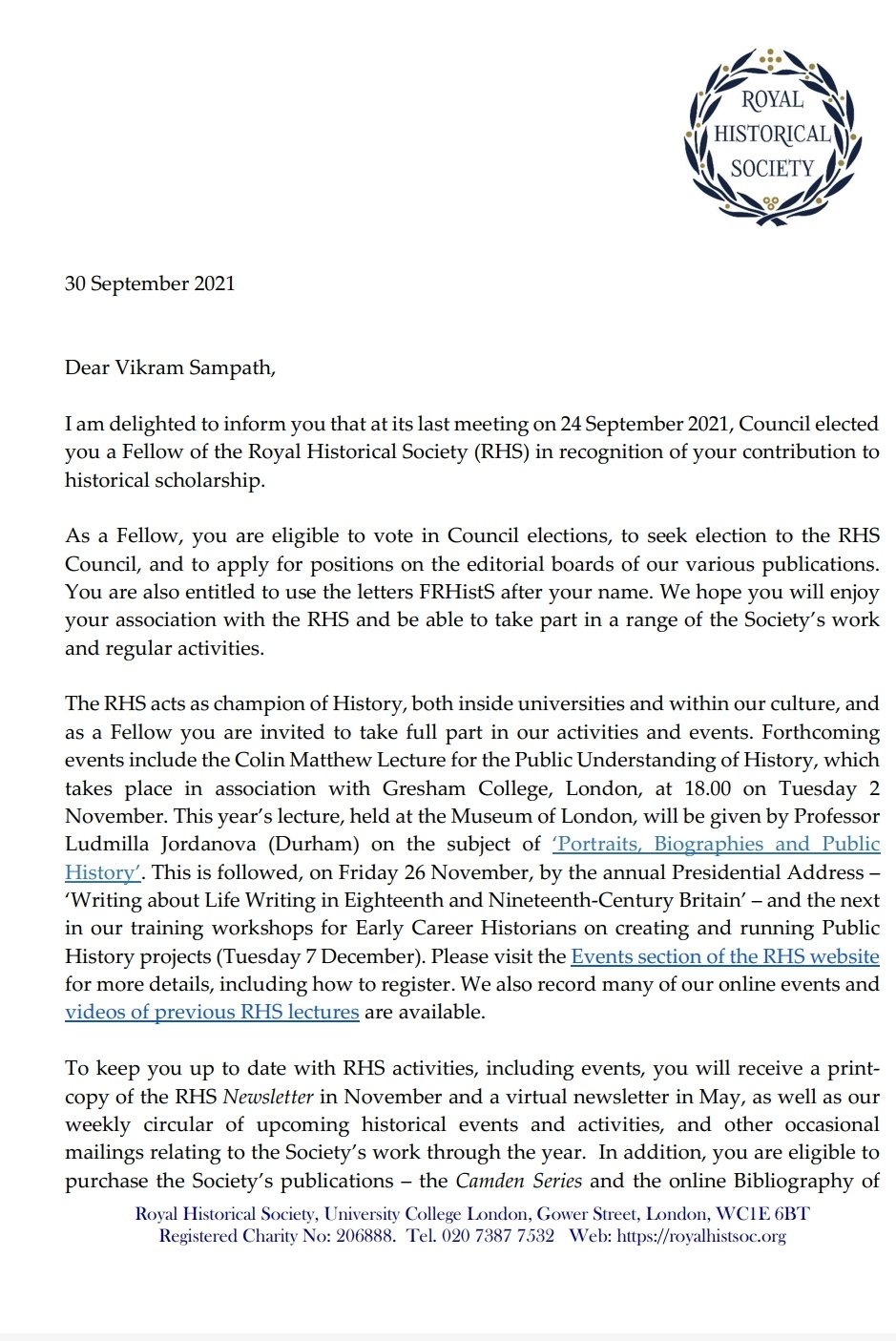 “As a fellow, you are eligible to vote in Council elections, to seek election to the RHS Council and to apply for positions on the editorial board of our various publications,” read the letter by RHS to Sampath.