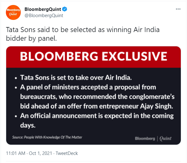 On Friday (October 1), a government-led panel held Tata Sons as the winner for the bid on national carrier Air India. In a tweet, Bloomberg reported, “Tata Sons is set to take over Air India. A panel of ministers accepted a proposal from bureaucrats, who recommended the conglomerate’s bid ahead of an offer from entrepreneur Ajay Singh. An official announcement is expected in the coming days.”