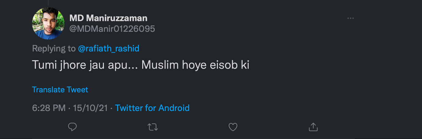 As Bangladesh continues to convulse with a violent spate of attacks against Hindu temples and minority Hindus, Islamists on Twitter recently descended on the timeline of Bangladeshi actor Rafiath Rashid Mithila for posting a tweet wishing Shubho Bijoya.
