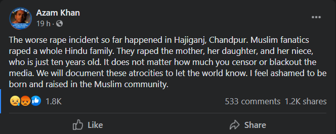 In a Facebook post that has now gone viral on social media, the secular blogger Azam Khan narrated the ordeal suffered by the unnamed Hindu family. He narrated, “The worse rape incident so far happened in Hajiganj, Chandpur. Muslim fanatics raped a whole Hindu family. They raped the mother, her daughter, and her niece, who is just ten years old.”