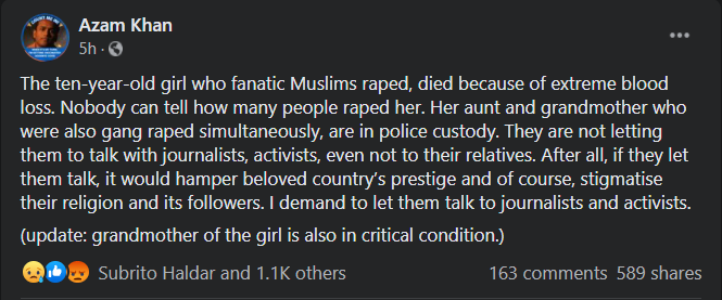 The blogger lamented that the minor Hindu girl succumbed to her injuries while her aunt and grandmother were confined to police custody. Azam Khan added, “The ten-year-old girl who fanatic Muslims raped, died because of extreme blood loss. Nobody can tell how many people raped her. Her aunt and grandmother who were also gang-raped simultaneously, are in police custody.”