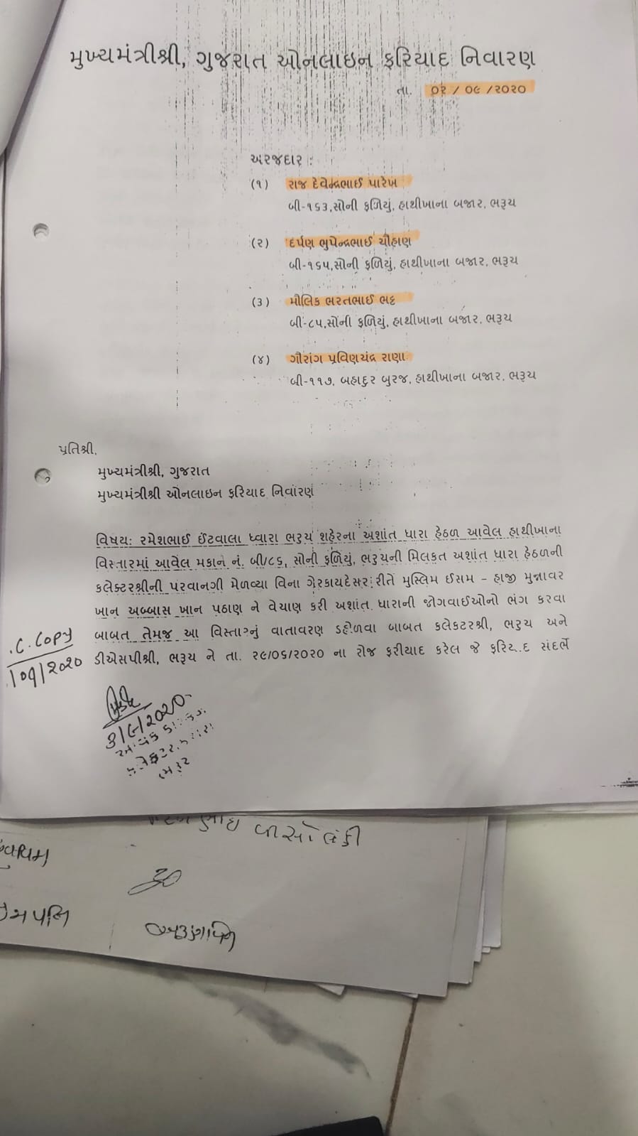 In a letter written to the administration, residents of Soni Faliya alleging illegal transfer of property to Muslim owners, said that the demography of the area is changing and it has turned into a Muslim dominated area. “If this happens, they could slaughter animals in public places which could be disturbing for Hindus, especially women and children, who are predominantly vegetarian. Similarly it may also cause hindrance to celebration of Hindu festivals. They have already stopped playing of religious songs at Jalaram Bapa temple and Shiva temple in the locality,” the residents say in a note to the Chief Minister of Gujarat written on 2nd September, 2020.