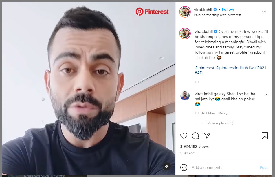 Kohli’s video on Instagram also mentions that the link should be in his bio, but the link posted there was of his merchandise store and not his Pinterest profile. The posts, however, mentioning that he would be giving tips to celebrate a “meaningful Diwali” are still available on both Twitter and Instagram.
