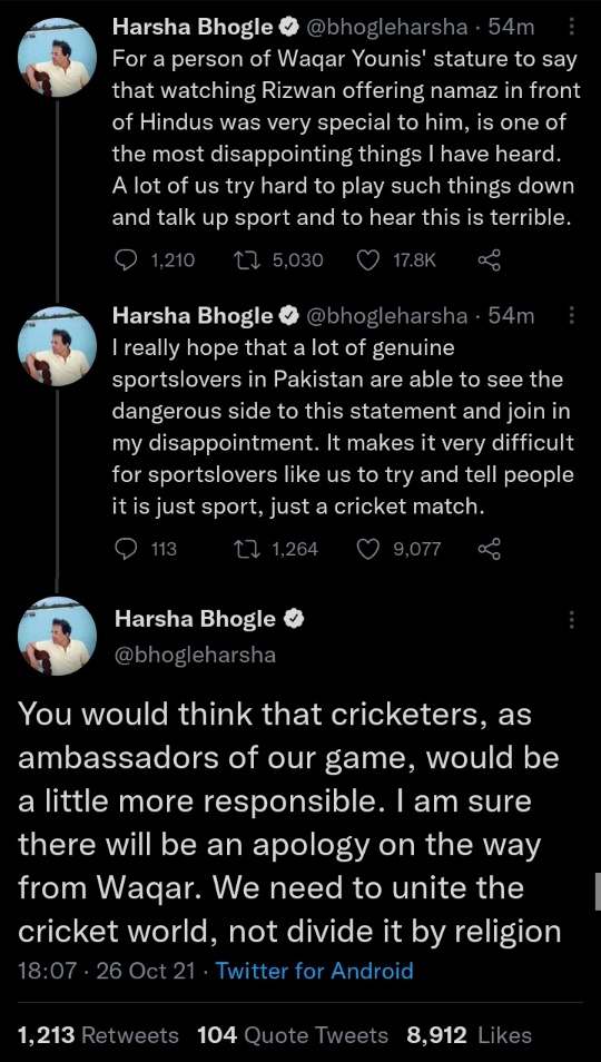 Harsha Bhogle said that it was one of the most disappointing things he had heard and it was terrible for Waqar Younis to say such a thing. Bhogle said, “For a person of Waqar Younis’ stature to say that watching Rizwan offering namaz in front of Hindus was very special to him, is one of the most disappointing things I have heard. A lot of us try hard to play such things down and talk up sport and to hear this is terrible.”