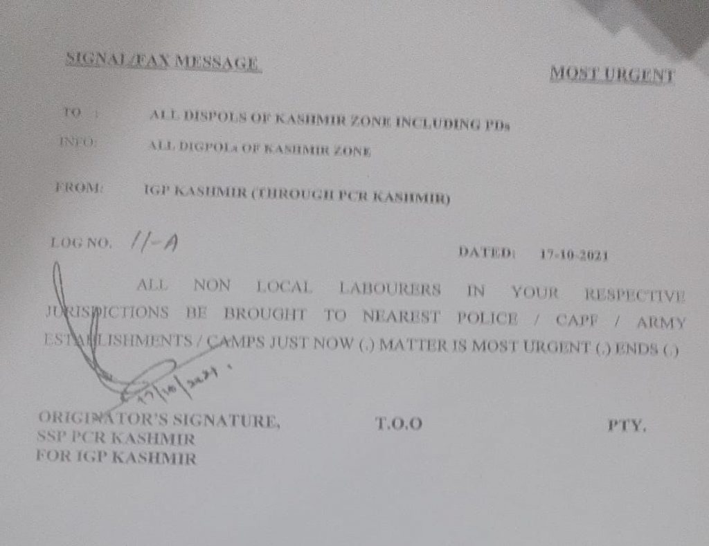 The reports of the directive by IGP Kashmir came hours after terrorists had entered a house in Wanpoh in Kulgam district where labourers from Bihar were staying and fired on them from close range. Joginder Reshi Dev and Raja Reshi Dev were killed in the attack, while Chunchun Reshi Dev was injured and shifted to hospital.