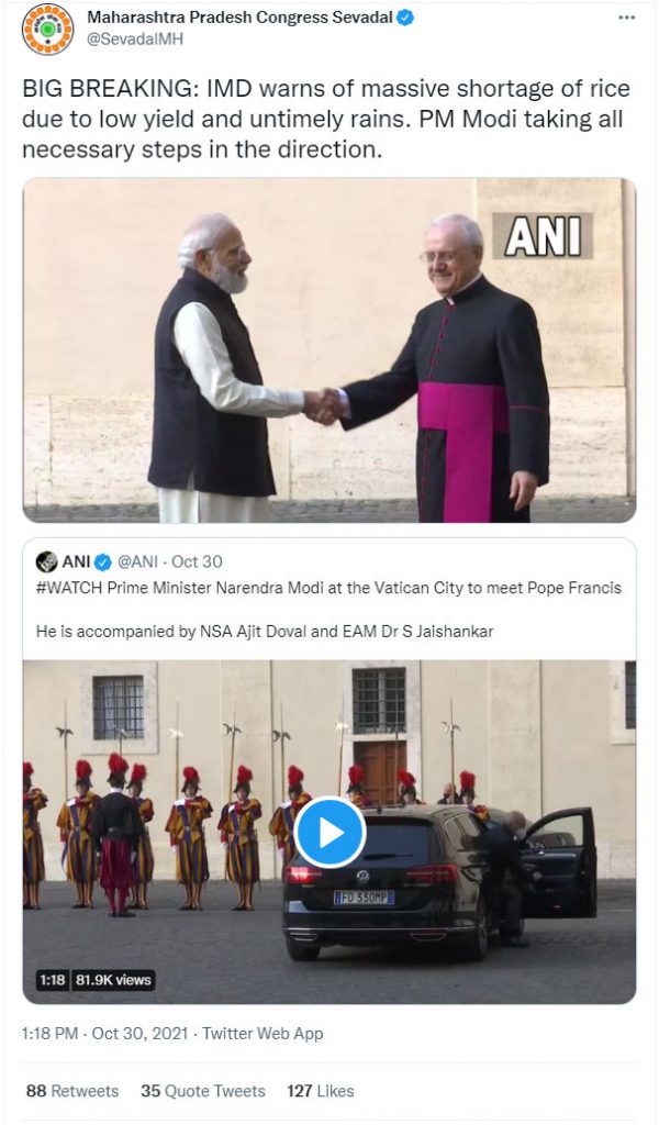 On October 30, quoting ANI’s tweet that talked about Prime Minister Narendra Modi’s meeting with Pope Francis at the Vatican, Maharashtra Pradesh Congress Sevadal cracked a ‘Rice Bag’ joke. The organization wrote, “BIG BREAKING: IMD warns of a massive shortage of rice due to low yield and untimely rains. PM Modi taking all necessary steps in the direction.”