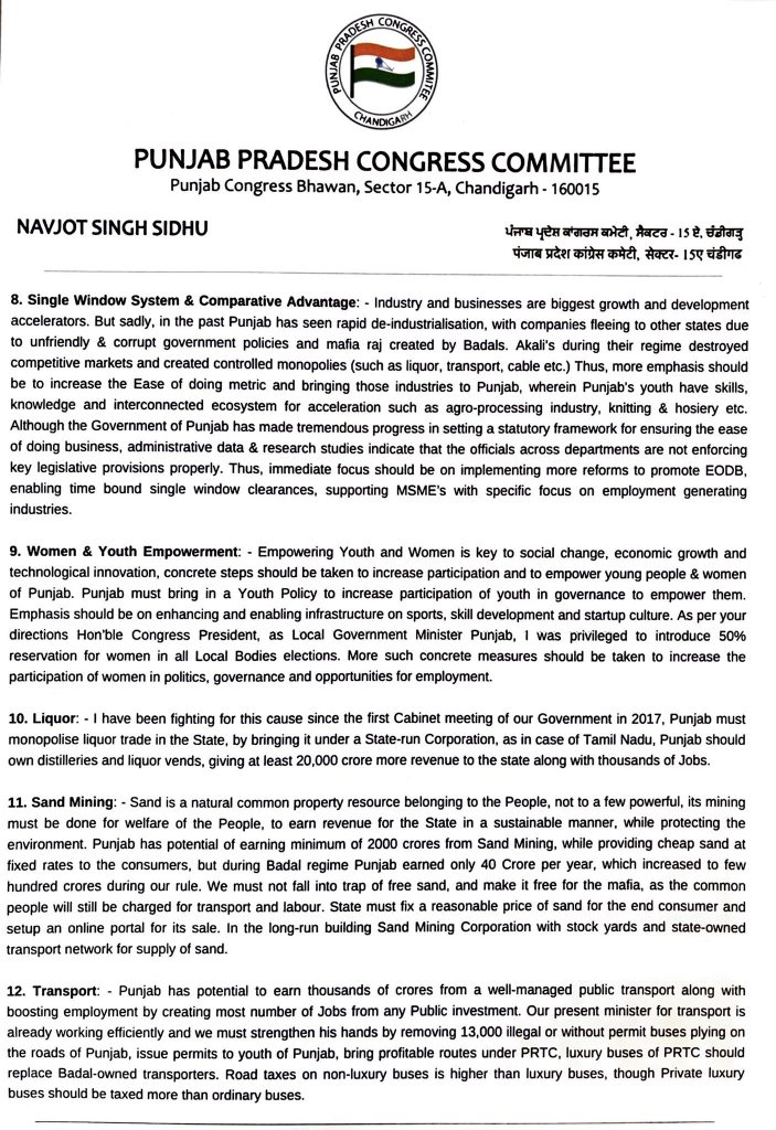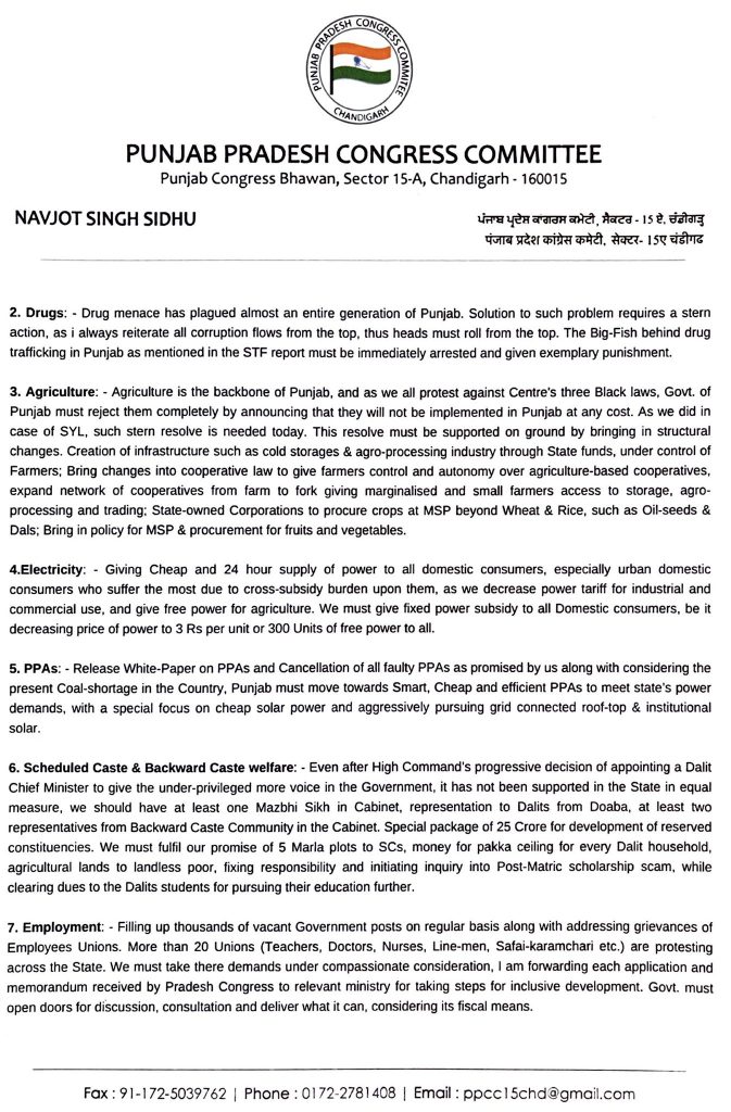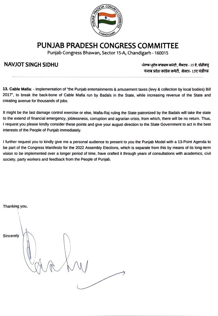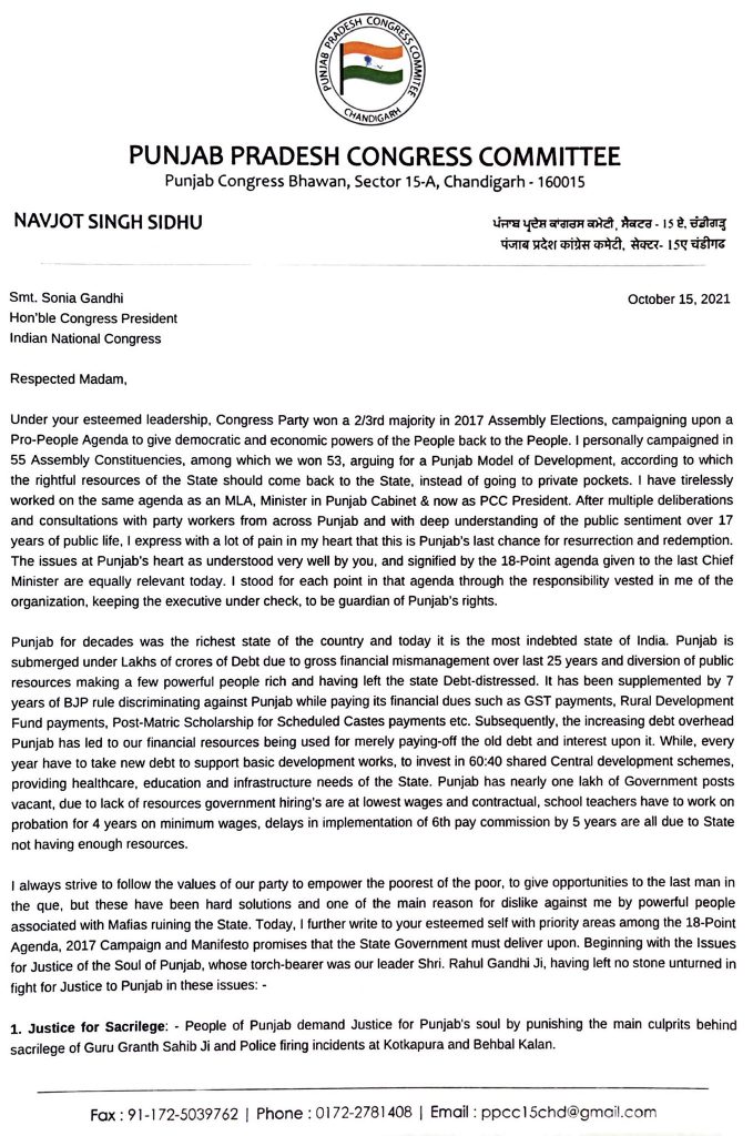 The 13 issues highlighted by Sidhu in his letter are Justice for sacrilege, drugs, agriculture, electricity, PPAs, Scheduled caste and Backward caste welfare, employment, Single window system and comparative advantage, Women and youth empowerment, liquor, sand mining, transport and cable mafia. The letter is dated for 15th October but was shared on social media today.