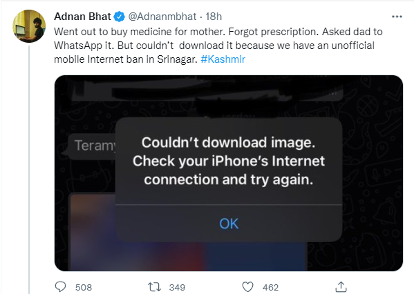 In a tweet, Bhat claimed, “Went out to buy medicine for mother. Forgot prescription. Asked dad to WhatsApp it. But couldn’t download it because we have an unofficial mobile Internet ban in Srinagar. #Kashmir.” A screenshot attached with his tweet was accompanied by the message – “Couldn’t download image. Check your iPhone’s Internet connection and try again.”