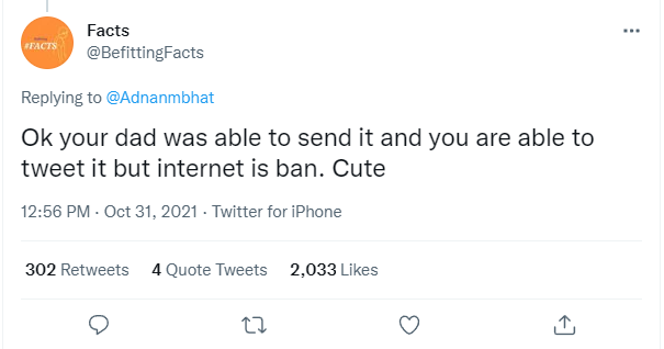 Popular Twitter user (@BefittingFacts) pointed out,” Ok your dad was able to send it and you are able to tweet it but internet is ban. Cute”