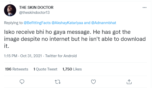 Another Popular Twitter user (@theskindoctor13) wrote, “He received the message. He got the image despite no internet but he isn’t able to download it.”