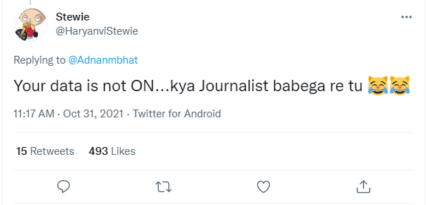 A Twitter user pointed out how Adnan Bhat had deliberately kept his mobile data to give the impression that there was an internet ban in Srinagar. “Your data is not on… What kind of journalist will you become?” he inquired.