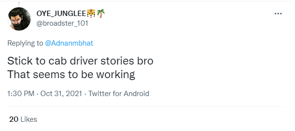 After realising several loopholes in the story, another Twitter user recommended Adnan Bhat to stick to cab driver stories that are often peddled by left-liberal journalists on the micro-blogging site.