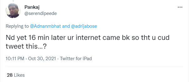 One Twitter user, Pankaj, asked how did the journalist regain his internet connection within just 16 minutes’ time.