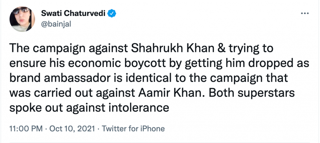 Swati Chaturvedi, a self-proclaimed journalist but who also doubles down as an abusive troll on social media websites, insinuated that Aryan’s arrest and denial of bail was a part of the central government’s ‘campaign’ against Shah Rukh Khan. She also compared SRK’s current predicament with Aamir Khan after the latter sparked outrage with his indiscreet utterances on the leftist trope of rising intolerance.