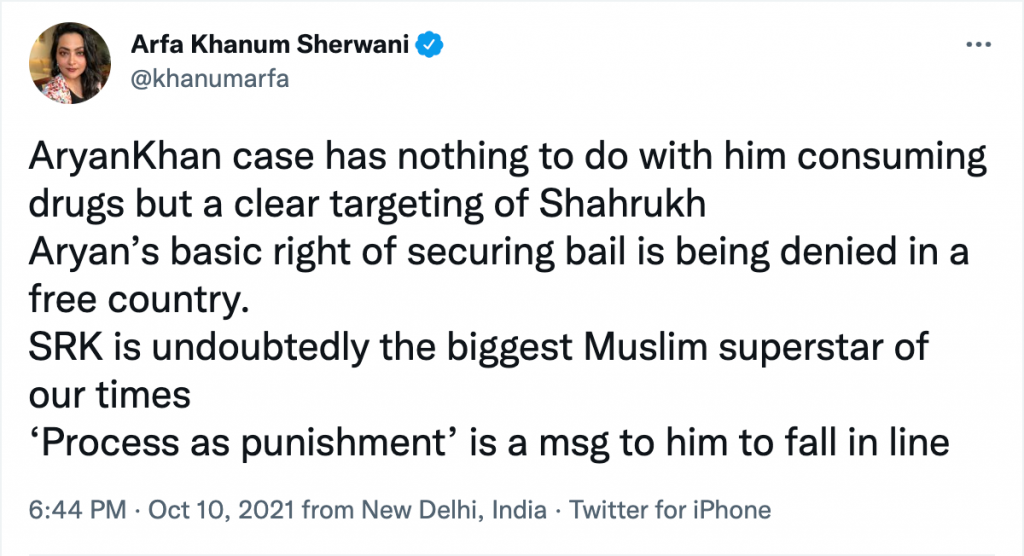Another celebrated ‘liberal’ Arfa Khanum Sherwani, who works for the far-left propaganda website The Wire, took to Twitter to declare that Aryan’s arrest was not related to a drugs case but a clear targeting of the actor Shahrukh Khan. Sherwani even went on to ludicrously claim that securing bail is a “basic right” and Aryan is being deprived of it.