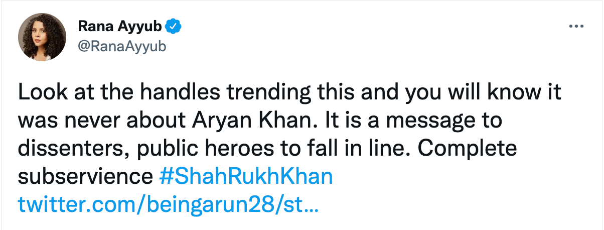 Journalist Rana Ayyub, who was recently mired in controversy related to misappropriation of funds through fundraisers, said Aryan Khan’s arrest was never about his culpability but a message for public dissenters to fall in line.