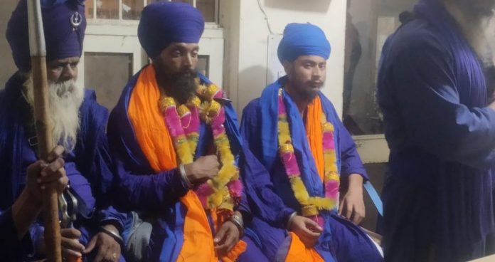 A video that has emerged on social media shows that ahead of the arrest, the two Nihang Sikhs were felicitated by fellow Nihangs with garlands, and a large group of Nihangs in their traditional blue attire followed them in a procession, shouting slogans and chants.