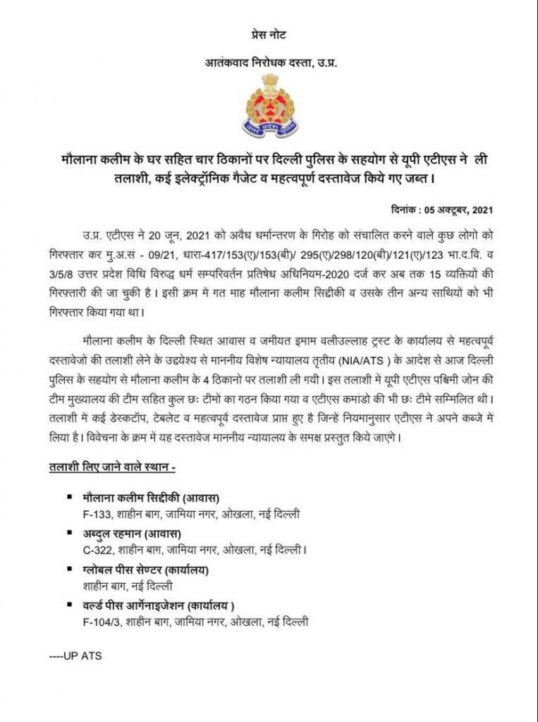 The Uttar Pradesh Anti-Terrorism Squad (ATS) on Tuesday conducted massive raids at the premises of Maulana Kaleem Siddiqui who has been accused of running India’s ‘biggest religious conversion syndicate’.