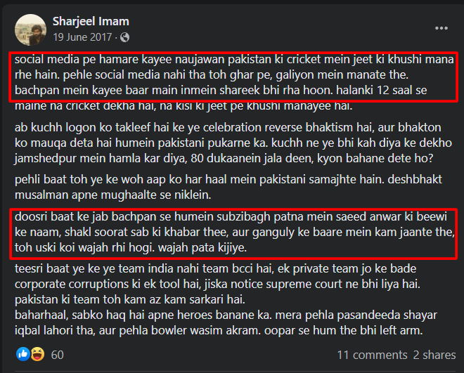 In a Facebook post dated June 17, 2017, Imam had confessed, “Several youngsters of our community have been celebrating the victory of Pakistan in the cricket match. When social media was not in existence, we would celebrate at our house or in our neighbourhood. On numerous occasions during childhood, I have participated in such celebrations.”