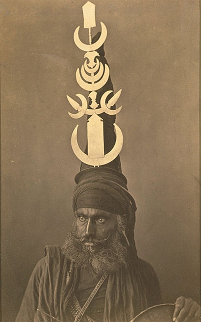 Nihangs are a Sikh sect, distinguished by their blue robes, called Khalsa Swarupa and decorated turbans (dastar bunga) surmounted with a chakram or steel quoits. Akali Naina Singh, a Nihang warrior and junior commander in the Shahid misl in the eighteenth century, is credited with inventing the towering pyramidal turban that is still worn by Nihangs today.